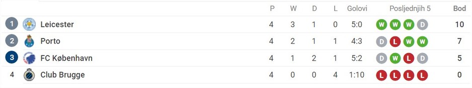 Aktuelni prvak Engleske Leicester City i dalje ne zna kako je primiti pogodak u Ligi prvaka, ali nakon maksimalne tri pobjede u dosadašnjem dijelu grupne faze, nije uspio slaviti u gostima protiv Kopenhagena (0:0).
