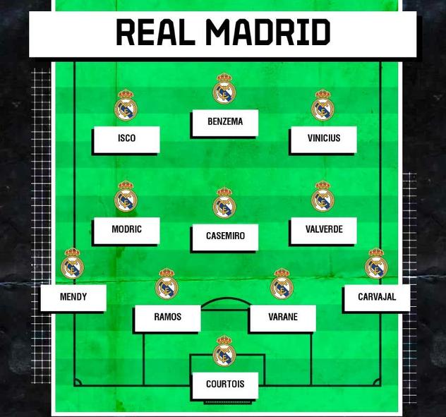 Real Madrid: Courtois; Carvajal, Ramos, Varane, Mendy; Modric, Casemiro, Valverde; Isco, Benzema, Vinicius Jr.
