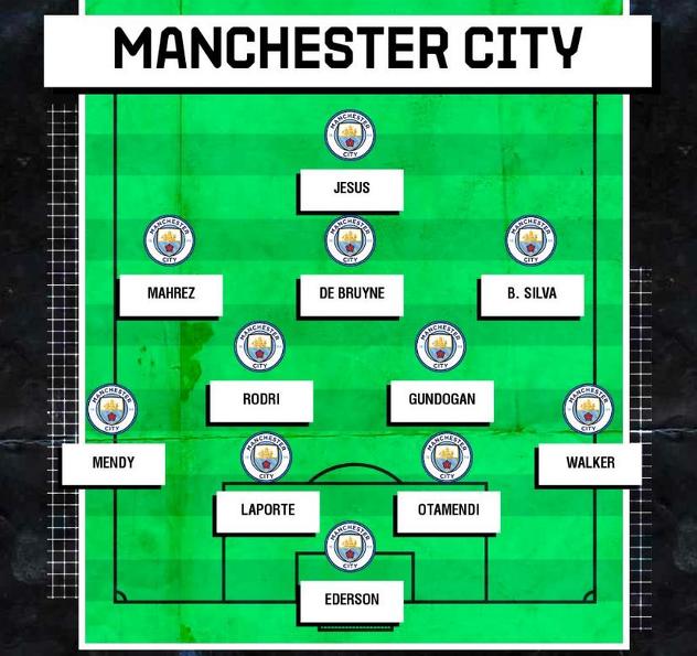 Manchester City: Ederson; Walker, Laporte, Otamendi, Mendy; Rodrigo, Gundogan, Mahrez, De Bruyne; Bernardo Gabriel Jesús