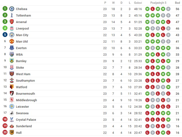 Chelsea je nakon ovog meča ostao na prvom mjestu sa devet bodova prednosti u odnosu na drugoplasirani Tottenham, dok je Liverpool četvrtoplasiran sa deset bodova zaostatka za liderom.