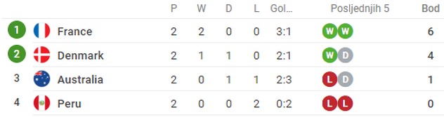 Danska je ranije danas remizirala s Australijom rezultatom 1:1 te se i ona nalazi nadomak plasmana u nokaut fazu, dok se Peru oprostio od Mundijala budući da više nema šansi za prolaz dalje.