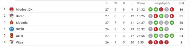 GOŠK u 5. kolu Lige za opstanak dočekuje Vitez, ekipu koja je već ispala iz lige. GOŠK mora po pobjedu pošto su Čelik i Sloboda jučer upisali po tri boda. Čelik je kod kuće savladao Mladost, dok je Sloboda na Tušnju pobijedila Borac.