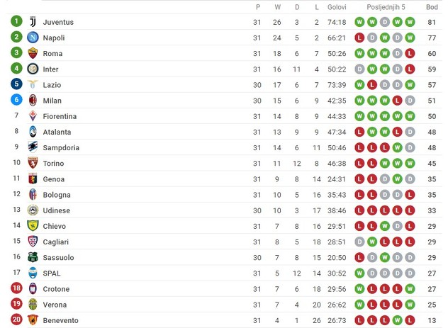 U ostalim utakmiacma, Verona je savladala Cagliari sa 1:0, identično kao i Crotone koji je savladao Bolognu.