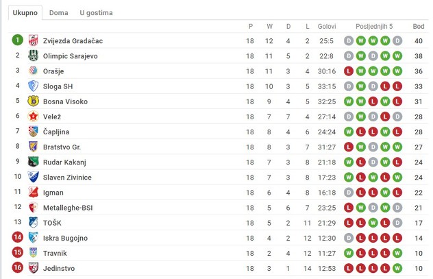Nakon 18. odigranih kola, Zvijezda je ostala na prvom mjestu sa 40 osvojenih bodova, dva više od Olimpika koji ima 38 i nalazi se na drugoj poziciji. Porazom u Bihaću, Sloga Simin Han ostala je na na 33 osvojena boda i sada se nalazi na četvrtoj poziciji s obzirom da Orašje sada ima 36 bodova.