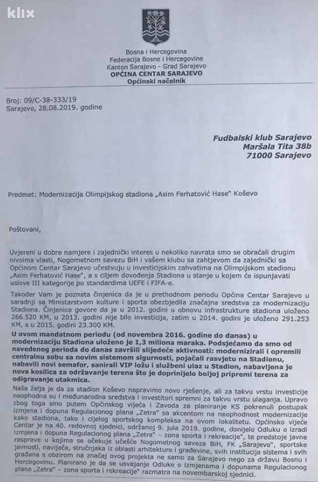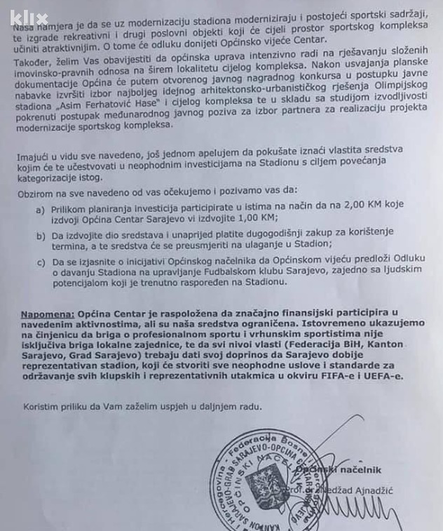 Općina Centar očekuje od FK Sarajevo i da se izjasni o inicijativa načelnika da Općinskom vijeću predloži odluku o davanju stadiona na upravljanje klubu zajedno s ljudskim potencijalom koji je trenutno raspoređen na stadionu.