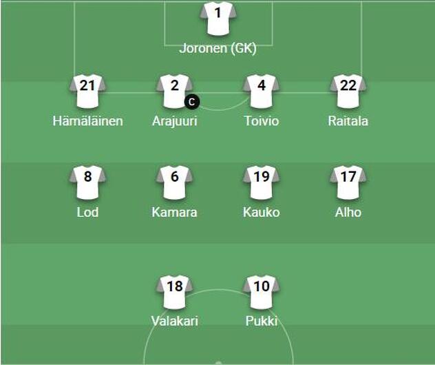 Selektor Finske Markku Kanerva se odlučio na sljedećih početnih 11 igrača: Joronen, Hamalainen, Arajuuri, Toivio, Raitala, Lod, Kamara, Kauko, Alho, Valakari i Pukki.
