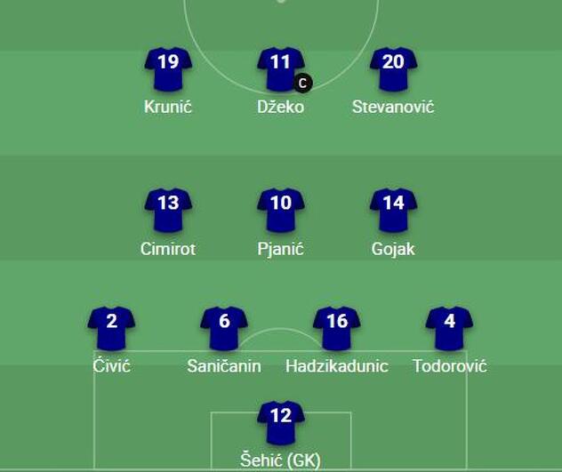 U veznom redu su Gojko Cimirot, Miralem Pjanić i Amer Gojak, po krilima su Rade Krunić i Miroslav Stevanović, dok će u napadu najistureniji biti kapiten Edin Džeko.