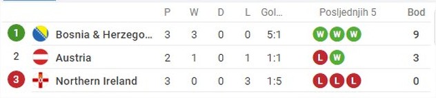 Reprezentacija BiH u ovom meču treba bod kako bi osigurala prvo mjesto u grupi, a prvi možemo biti i uz poraz od jednog gola razlike uz to da postignemo makar jedan gol. Pobjeda Austrije s više od jednog gola razlike značila bi da Austrija može biti prva ukoliko slavi i protiv Sjeverne Irske u posljednjem kolu. Ukoliko Austrija sutra slavi rezultatom 1:0 te onda pobijedi i Sjevernu Irsku, onda bi se na kraju gledala ukupna gol-razlika u svim mečevima. A trenutna gol-razlika Zmajeva iznosi 5:1, dok gol-razlika Austrije iznosi 1:1.