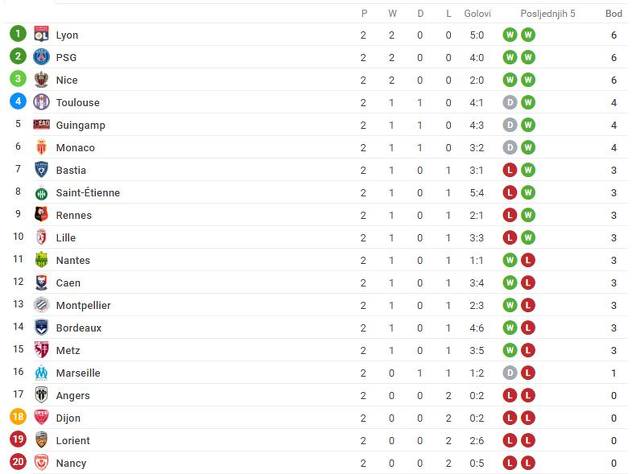 Guingamp je rezultatom 2:1 slavio protiv Marseillea koji je i dalje bez pobjede, jer je u 1. kolu na domaćem terenu remizirao sa Toulouseom (0:0). Salibur (1') i Sorbon (58') pogađali su za domaći tim, dok je jedini gol za goste postigao Thauvin u 78. minuti.