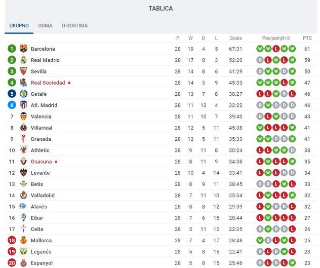 Podsjećamo, Barcelona je ranije savladala Mallorcu rezultatom 4:0 te je tako zadržala vodstvo u odnosu na Real Madrid, a ono i nakon ovog kola iznosi dva boda.
