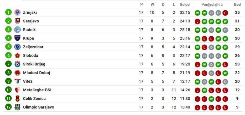 Rezultati 17. kola Premijer lige BiH: