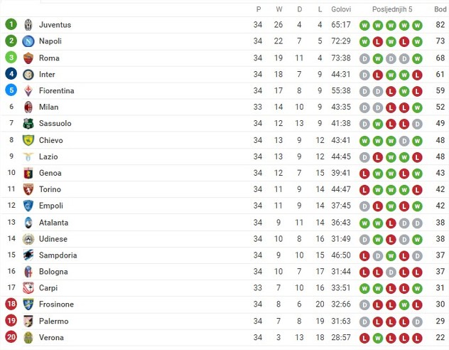 Juventus je nadigrao Lazio sa 3:0. Juve je poveo u 39. minuti preko Mandžukića, a u 52. minuti Dybala je iz penala udvostručio prednost, a isti igrač je pogodio i za 3:0 u 64. minuti. Senad Lulić je odigrao svih 90 minuta za Lazio.