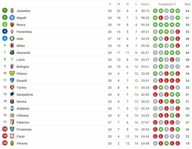 Frosinone je također slavio sa 2:0. Golove protiv Udinesea postigli su Ciofani u 12. i Blanchard u 60. minuti susreta.
