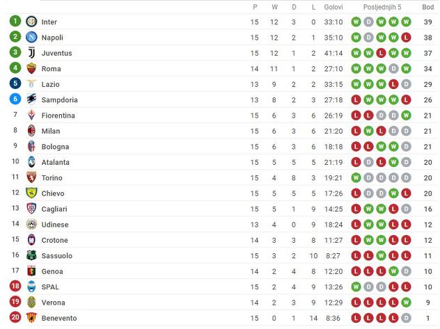 Nakon 15 odigranih utakmica ekipa Intera preuzela je vrh tabele Serije A, a oni se sada usamljeni nalaze na vrhu sa 39 osvojenih bodova, jedan više od Napolija i dva više od Juventusa.
