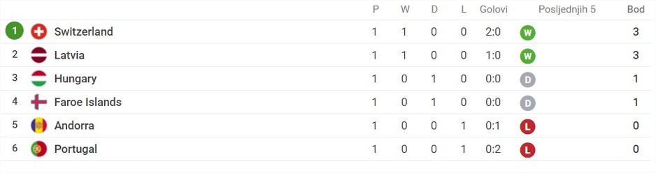 Švicarskoj je na megdan stigao aktuelni evropski prvak Portugal. Izabranici Vladimira Petkovića ušli su u ovaj dvoboj bez previše respekta. Već u prvom poluvremenu vodili su 2:0. Embolo je pogodio u 23., a Mehmedi u 30. minuti meča. Asistent drugog gola bio je Haris Seferović. U nastavku su domaći čuvali stečenu prednost i osvojili su kompletan plijen.