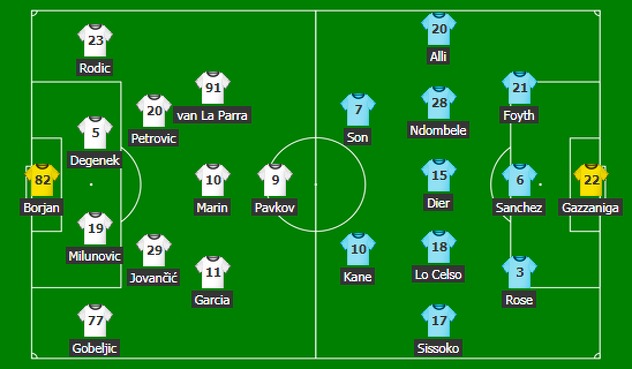 Tottenham: Gazzaniga, Rose, Sanchez, Foyth, Sissoko, Lo Celso, Dier, Ndombele, Alli, Kane i Son.