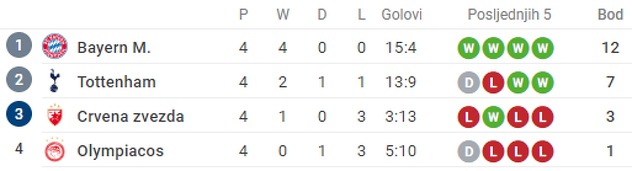 Tottenham sada ima sedam bodova na drugom mjestu, odnosno pet manje od lidera Bayerna, dok je Zvezda na trećem mjestu s tri osvojena boda.