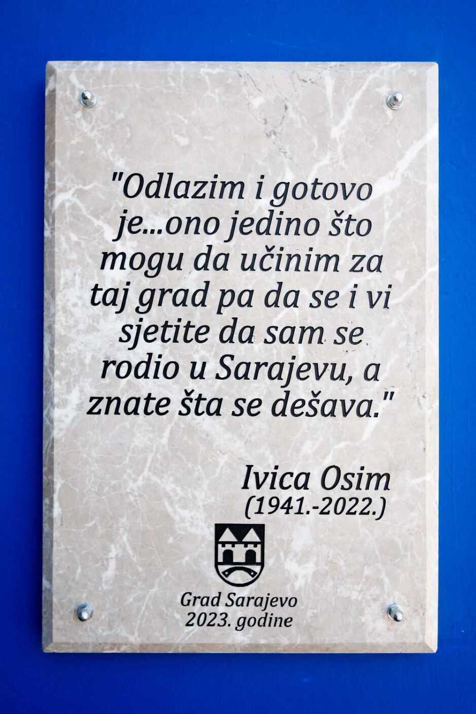 "Odlazim i gotovo je... Ono jedino što mogu da učinim za taj grad pa da se i vi sjetite da sam se rodio u Sarajevu, a znate šta se dešava", stoji na spomen ploči na ulazu u prostorije stadiona Grbavica.