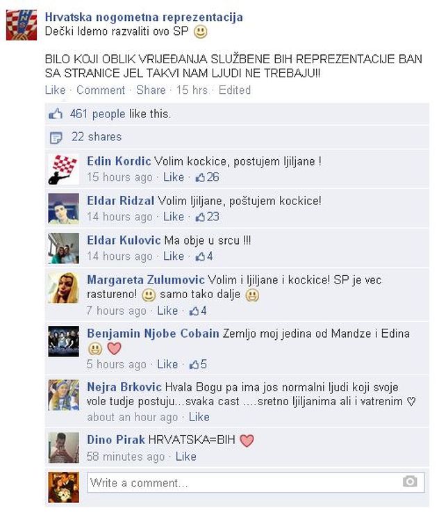 Neki od komentara ispod fotografije su: "Volim kockice, poštujem ljiljane!", "Zemljo moja jedina od Mandže i Edina", "Hrvatska=BiH", što nam govori da će naši Zmajevi sutra imati podršku u okršaju sa Nigerijom u Cuiabi iz susjedne Hrvatske. Vatreni će biti uz naše Zmajeve.