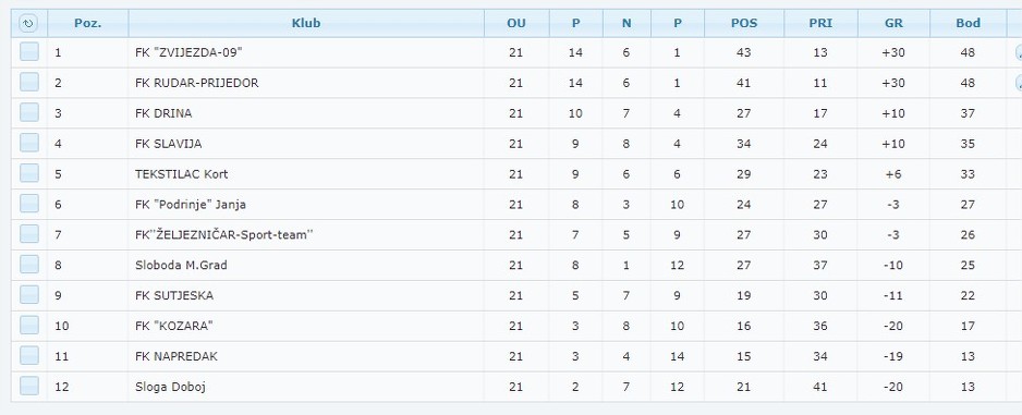 Sloboda Mrkonjić Grad - Zvijezda 09 1:6 Rudar Prijedor - Drina 1:0 Sloga Doboj - Sutjeska 2:2 Slavija - Podrinje Janja 1:0 Kozara - Napredak 0:0 Željezničar Sport-team - Tekstilac 1:1