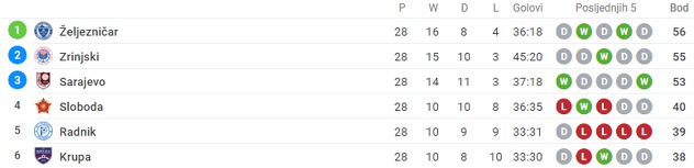 Sloboda je trenutno četvrta sa 40 bodova, Radnik na petom mjestu ima bod manje, dok je šestoplasirana Krupa na zaostatku od dva boda.