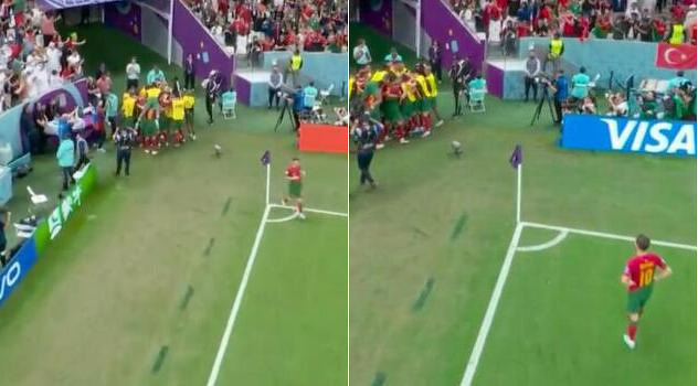 No, Bernardo Silva je samo prišao sretnoj grupi i odmah se udaljio od saigrača i ušao u teren te ih kod korner-zastavice bodrio.