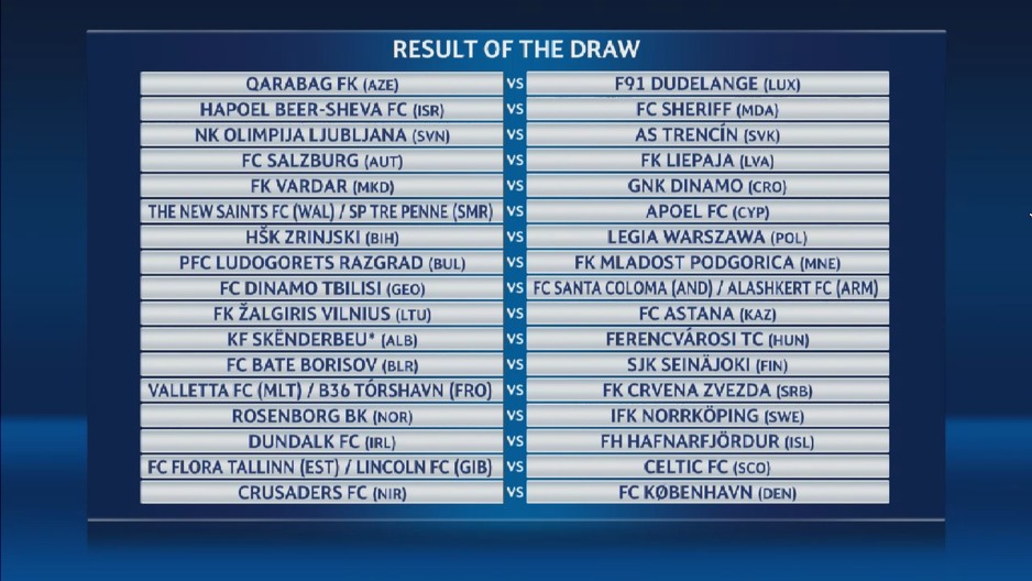 Parovi drugog pretkola: Zrinjski (BiH) - Legia (Poljska, Qarabag (Azerbejdžan) - F91 Dudelange (Luksemburg), Hapoel Beer-Sheva (Izrael) - Sheriff (Moldavija), Olimpija Ljubljana (Slovenija) - Trenčin (Slovačka), Salzburg (Austrija) - Liepaja (Latvija), Vardar (Makedonija) - Dinamo (Hrvatska). pobjednik meča 2 - APOEL (Kipar), Ludogorec (Bugarska) - Mladost (Crna Gora), Dinamo Tbilisi (Gruzija) - pobjednik meča 4, Žalgiris (Litvanija) - Astana (Kazahstan), Skenderbeu (Albanija) - Ferencvaros (Mađarska), BATE (Bjelorusija) - SJK (Finska), pobjednik meča 3 - Crvena zvezda (Srbija), Rosenborg (Norveška) - Norrkoping (Švedska), Dundalk (Irska) - Hafnarfjordur (Island), pobjednik meča 1 - Celtic (Škotska), Crusaders (sjeverna Irska) - Copenhagen (Danska).