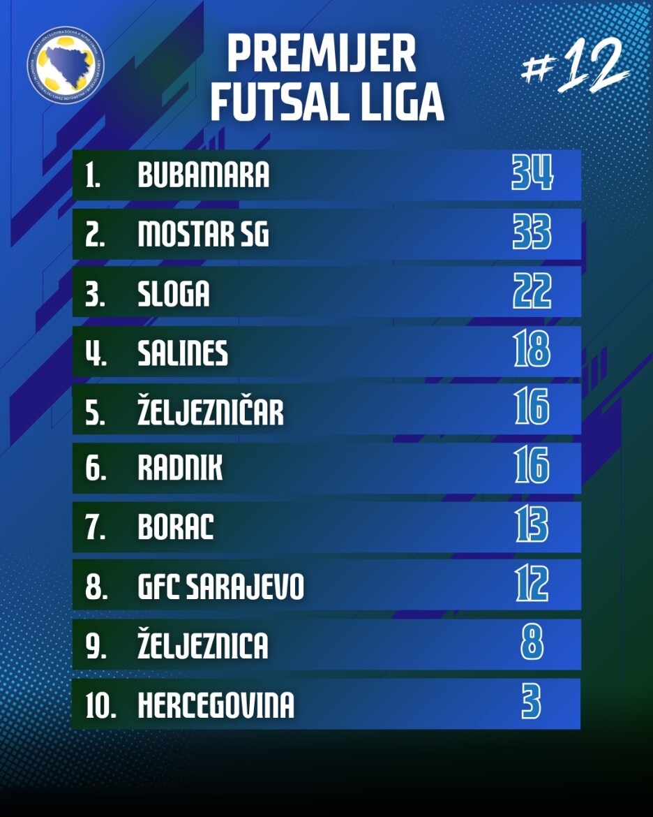 Bubamara je prva na tabeli s 34 boda ispred Mostara SG koji ima bod manje. Sloga je na trećem mjestu s 22 osvojena boda.