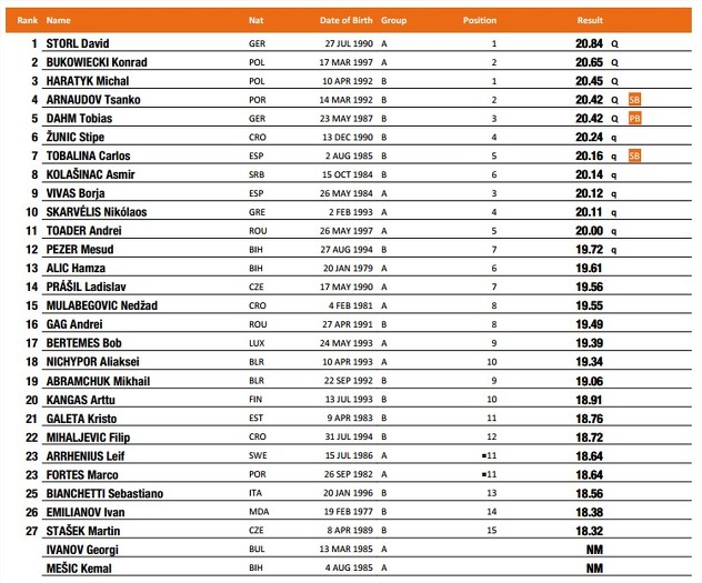 Naš treći takmičar Pezer u prvoj seriji dobacio je do 19,15 metara, drugi njegov hitac bio je njegov najbolji i završio je na udaljenosti 19,72 metara što je bilo dovoljno za 12. mjesto na konačnoj listi i za plasman u finale. Pezer je u trećoj seriji dobacio do 19,67 m.