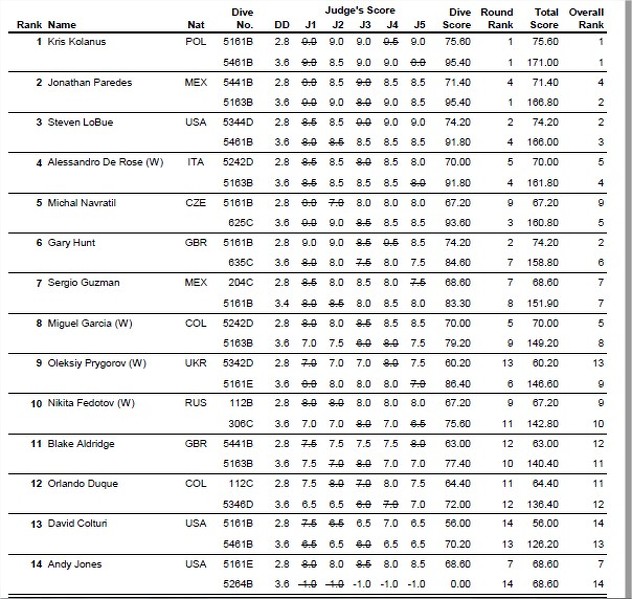 Nakon pet održanih stanica u ovoj sezoni u muškoj konkurenciji s 480 osvojenih bodova prvi je Blake Aldridge iz Velike Britanije, a iza njega su Gary Hunt (Velika Britanija) s 460 bodova i Jonathan Paredes (Meksiko) s 450 bodova.