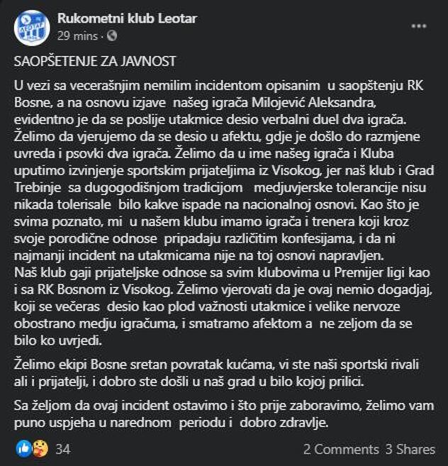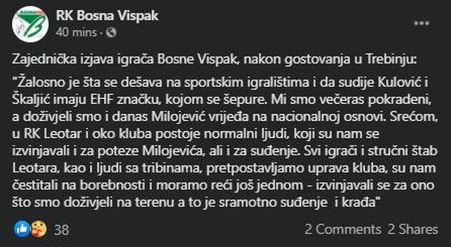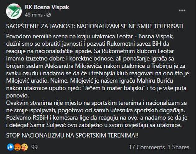 "Povodom nemilih scena na kraju utakmica Leotar - Bosna Vispak, dužni smo se obratiti javnosti i pozvati Rukometni savez BiH da reaguje na nacionalističke ispade. Sa Rukometnim klubom Leotar imamo izuzetno dobre i korektne odnose, ali ponašanje igrača sa brojem sedam Aleksandra Milojevića, nakon utakmice u Trebinju je za svaku osudu i nadamo se da će i trebinjski klub reagovati na ono što je Milojević uradio. Naime, Milojević je našem igraču Mahiru Buriću nakon utakmice uputio riječi: 'Je*em ti mater balijsku' i to je više puta ponovio.