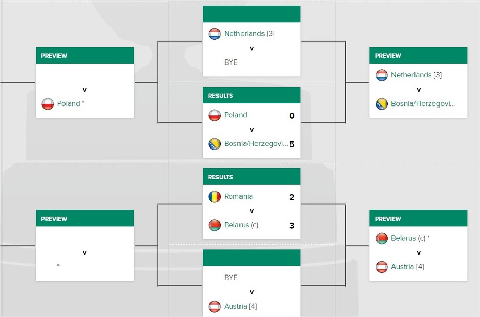 Mirza Bašić (BiH) - Kamil Majchrzak (Polj) 2:0 (predaja) Damir Džumhur (BiH) - Hubert Hurkacz (Polj) 3:0 Mirza Bašić/Tomislav Brkić (BiH) - Marcin Matkowski/Lukasz Kubot (Polj) 3:2 Damir Džumhur (BiH) - Kamil Majchrzak (predaja) Tomislav Brkić (BiH) - Hubert Hurkacz (Polj) 2:1