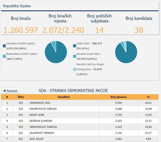 SDA je u RS-u za Parlament BiH osvojila ukupno 20.969 glasova, od čega je najviše osvojio Osmanović. Poređenja radi, SDP je u RS-u za državni parlament osvojio nešto više od 6.500 glasova, a SBB 926 glasova.