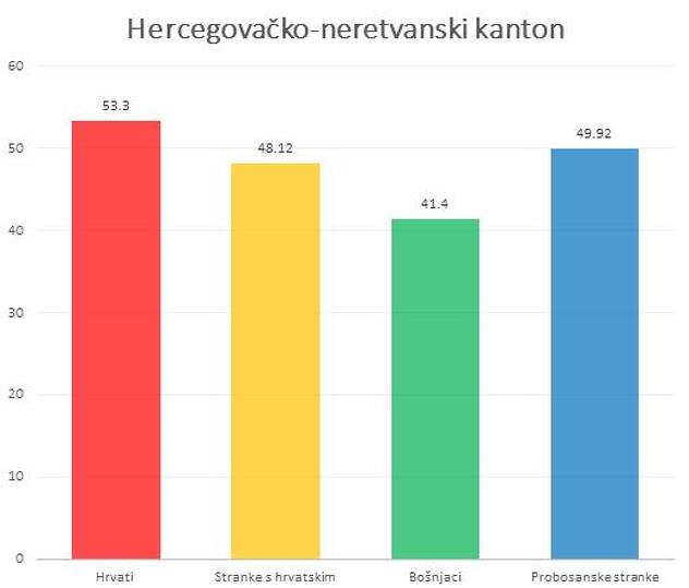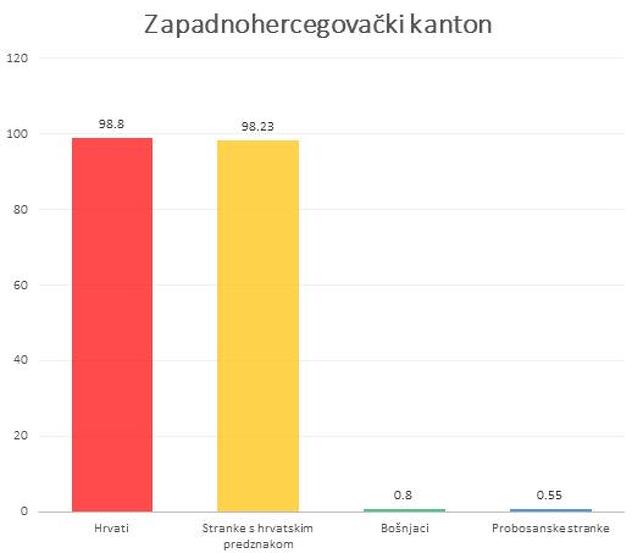 Čak i u Hercegovačko-neretvanskom kantonu, gdje su Hrvati većinsko stanovništvo, probosanske stranke osvajaju više glasova od stranaka s hrvatskim predznakom.