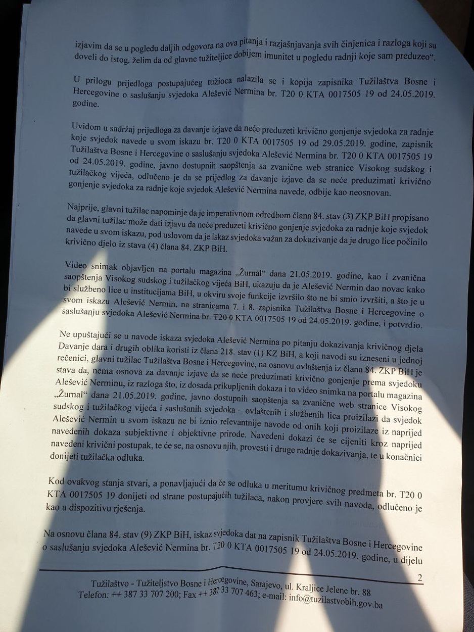 U rješenju glavne tužiteljice Tužilaštva BiH Gordane Tadić navodi se da je postojao prijedlog u izvještaju postupajućeg tužioca nakon prvog saslušanja Nermina Aleševića, da mu se da imunitet, odnosno garancija da neće krivično odgovarati zbog postupaka koje je poduzeo u aferi "Potkivanje".
