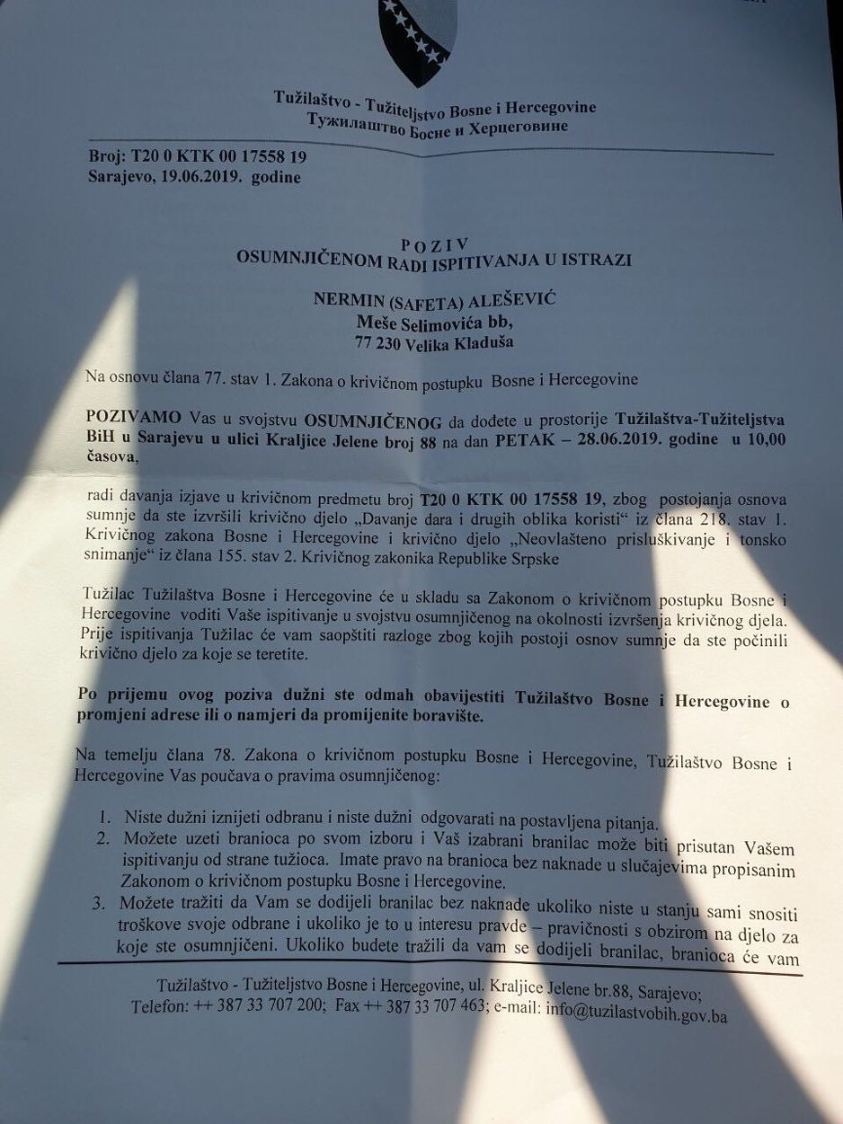 Nermin Alešević je dobio poziv da se sutra u 10 sati javi u Tužilaštvo BiH, a tužiteljica koja vodi slučaj je Merisa Nurkić.