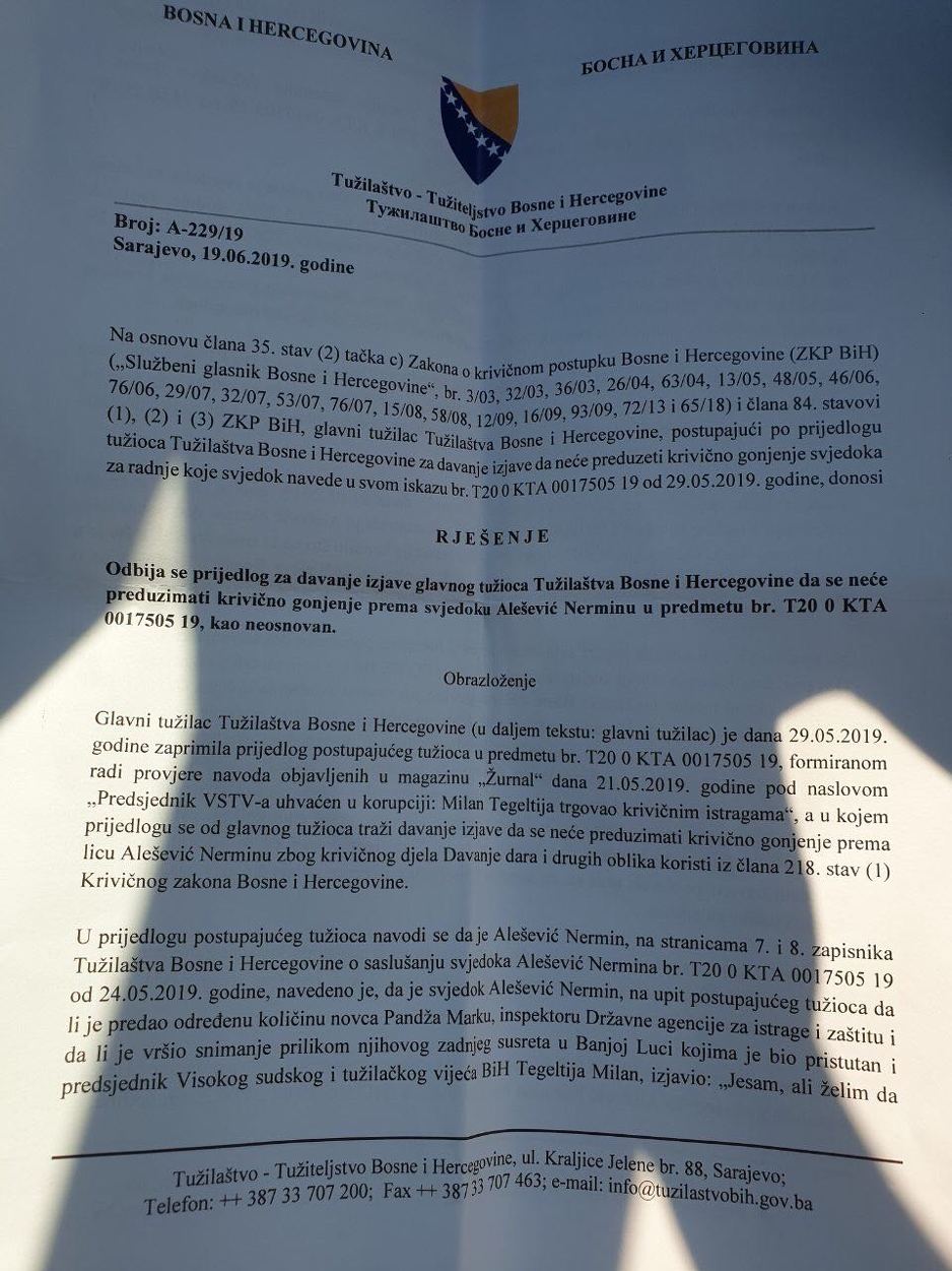 Tadić je odbila takav prijedlog i Nermin Alešević je osumnjičen za davanje mita i neovlašteno snimanje. Zbog toga će se u petak, 28. juna, morati pojaviti u Tužilaštvu BiH kao osumnjičeni.