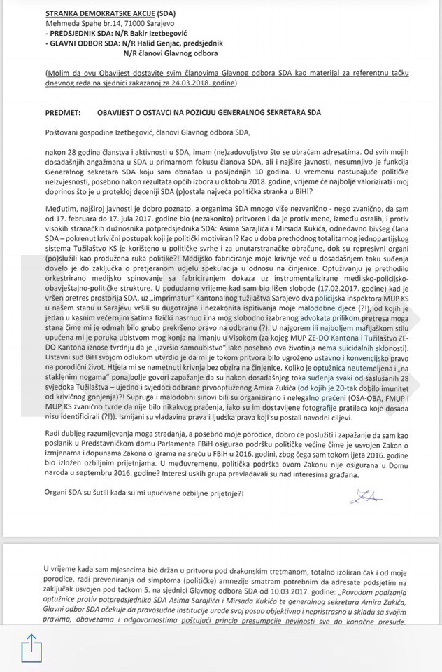 On je u pismu koje je uputio predsjedniku SDA Bakiru Izetbegoviću, predsjedniku Glavnog odbora SDA Halidu Genjcu i članovima Glavnog odbora SDA naveo kako će vrijeme nakon rezultata izbora 2018. godine najbolje valorizirati njegov doprinos tome što je SDA u posljednjoj godini (p)ostala najveća politička stranka u BiH.