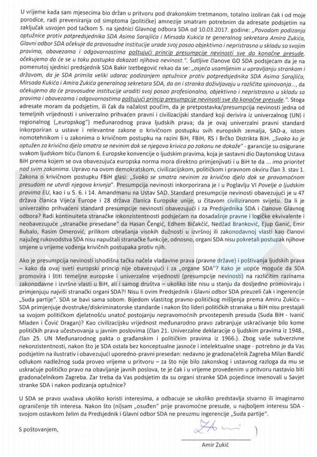 "Povodom podizanja optužnice protiv potpredsjednika SDA Asima Sarajlića i Mirsada Kukića te generalnog sekretara Amira Zukića Glavni odbor SDA očekuje da pravosudne institucije urade svoj posao profesionalno, objektivno i nepristrasno, u skladu sa svojim pravima, obavezama i odgovornostima. Poštujući princip presumpcije nevinosti sve do konačne presude, očekujemo da će se u toku postupka dokazati njihova nevinost do konačne presude", piše u zaključku Glavnog odbora SDA.