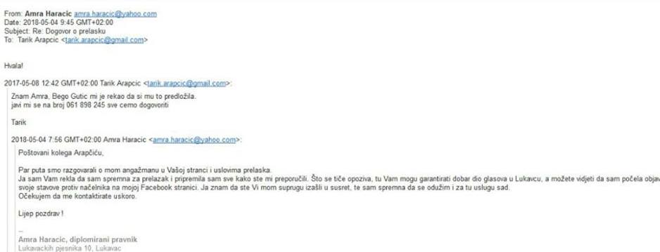 "Želim upoznati javnost da je u današnje vrijeme vrlo jednostavno koristeći informatičke mogućnosti (npr. program faik mailer) kreirati i monitirati bilo kakve prepiske, gdje se kreiraju e-mail adrese i onda šalju mailovi kao da su sa vaše lične adrese, što je najverovatniji događaj kojim će se u narednom periodu nakon podnošenja krivične prijave protiv DF-a, baviti tužilaštvo i sud", ističe Haračić.