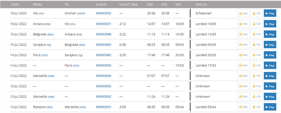 Kako se može vidjeti, ovaj avion je 14. jula u večernjim satima doletio iz Pariza na Međunarodni aerodrom Sarajevo, gdje je i prenoćio. Dan kasnije, 15. jula u jutarnjim satima je iz Sarajeva odletio za Beograd.