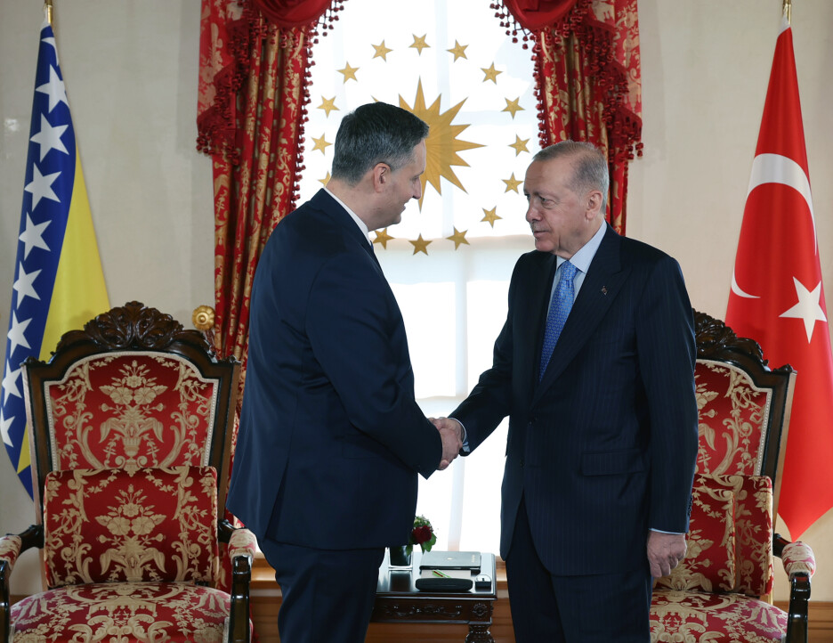 Nakon srdačnog dočeka, počeo je sastanak Denisa Bećirovića i predsjednika Republike Turske Recepa Tayyipa Erdoğana na kojem će razgovarati o aktuelnoj sigurnosnoj situaciji u Bosni i Hercegovini i regiji.
