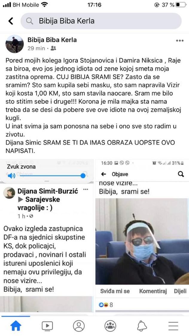 "Pored mojih kolega Igora Stojanovića i Damira Nikšića, Raje sa biroa, evo još jednog idiota od žene kojoj smeta moja zaštitna oprema. Čuj, Bibija, srami se! Zašto da se sramim? Što sam kupila sebi masku, što sam napravila vizir koji kosta 1.00 KM, što sam stavila naočale? Sram me bilo što štitim sebe i druge! Korona je mila majka šta nama treba da se desi da pobere sve ove idiote na ovoj zemaljskoj kugli. U inat svima, ja sam ponosna na sebe i ono sve što radim u životu", napisala je Kerla odgovorivši jednoj građanki.