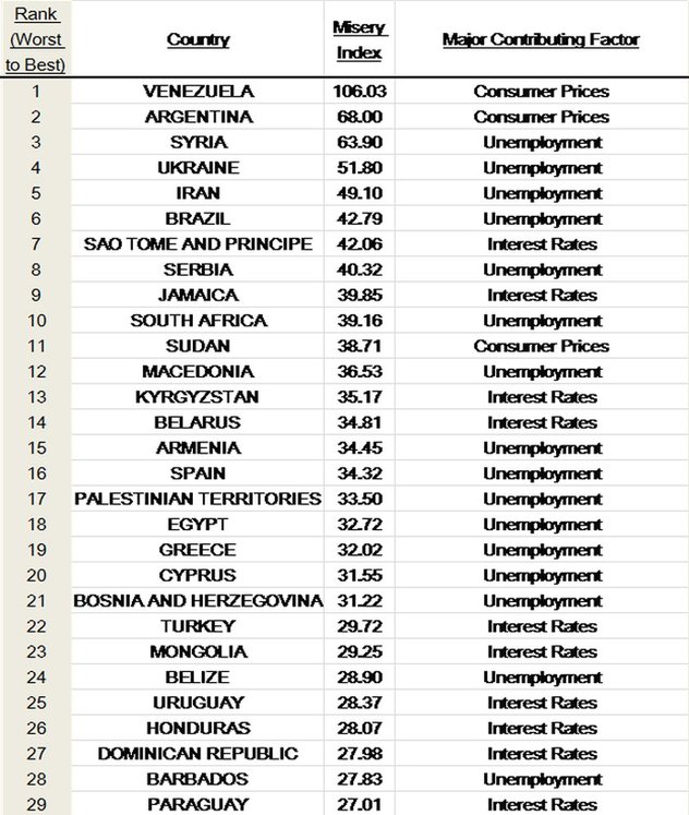 Prema podacima Cato Instituta koji je objavio ovo istraživanje, najjadnija zemlja svijeta je Venezuela s indeksom 106,3. Cato Institut je svoje indekse bazirao na podacima zemalja o inflaciji, aktivnim kamatnim stopama i procentu nezaposlenosti, te godišnjem BDP-u