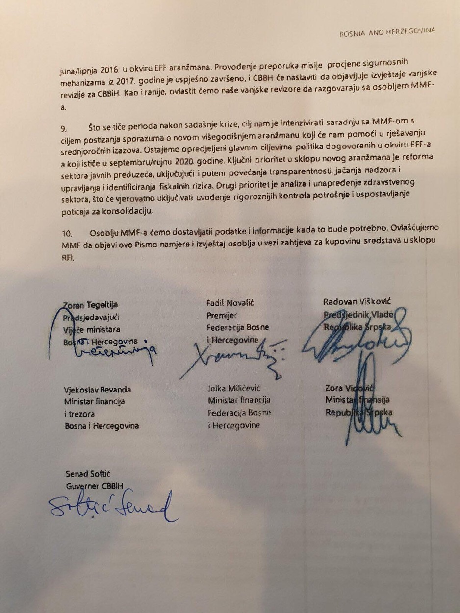 Jedina dva potpisa koja nedostaju su ona od ministra finansija BiH Vjekoslava Bevande te federalne ministrice finansija Jelke Milićević.