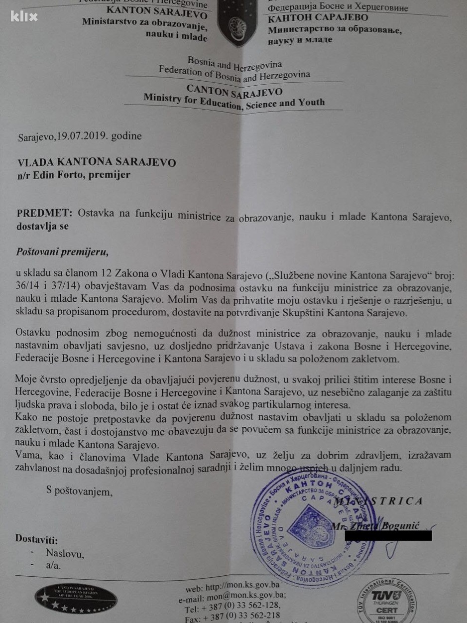 "Ostavku podnosim zbog nemogućnosti da dužnost ministrice za obrazovanje, nauku i mlade nastavim obavljati savjesno, uz dosljedno pridržavanje Ustava i zakona BiH, FBiH i KS i u skladu s položenom zakletvom", napisala je Bogunić.