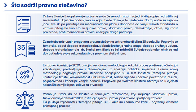 "Otvaranje pristupnih pregovora je značajna prekretnica za svaku zemlju koja teži pridruživanju Evropskoj uniji, a označava početak strukturiranog procesa kojim se zemlja na putu ka članstvu priprema da u potpunosti usvoji zajednička prava i dužnosti koji su obavezujući za sve države članice EU. Cjelokupni korpus propisa EU, odnosno pravna stečevina, poznata je pod francuskim terminom 'acquis communautaire' ili skraćeno 'acquis' (što se približno prevodi kao 'zajednička dostignuća Evropske zajednice')", navodi se.