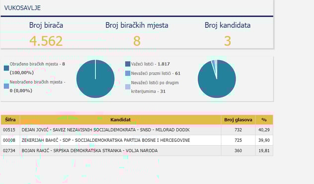 Bahić je osvojio 725 glasova nakon 100 posto obrađenih glasačkih listića, što je 39,90 posto dok je Jović osvojio 732 glasa, što je 40,29 posto.