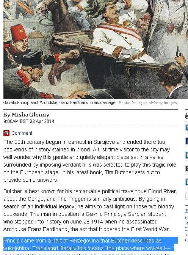 No, Telegraph navodi kako je Princip došao (u Sarajevo) iz dijela Hercegovine kojeg Butcher opisuje kao vukoinu. Potom Telegraph pokušava doslovno prevesti tu riječ, pa je tako prevode kao "mjesto gdje vukovi j". Potom dodatno objašnjavaju kako se radi o mjestu koje je pusto i na vjetrometini, da bi čitateljima dočarali o kakvom se području zapravo radi i šta ta riječ znači.