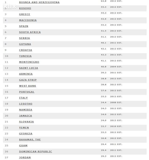 Naime, nezaposlenost mladih osoba u BiH, prema podacima CIA-e, iznosi nevjerovatnih 62,8 posto, a kao relevantni podaci korišteni su oni iz 2012. godine. Odmah ispod BiH nalaze se Kosovo i Grčka s 55,3 posto, zatim Makedonija s 53,9 posto, Španija s 53,2 posto, Južna Afrika (51,5 posto), Srbija (51,1 posto), Gvajana (46,1 posto), Hrvatska (43,1 posto) i Tunis (42,3 posto). Kompletnu listu možete pogledati ovdje.